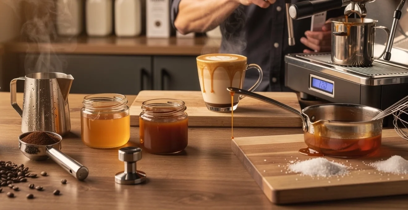 Le caramel au beurre salé artisanal apporte une dimension plus complexe et gastronomique. Sa texture plus épaisse nécessite un mélange plus énergique, mais la récompense est à la hauteur : notes de beurre noisette, pointe de sel de mer et longueur en bouche remarquable. Vous pouvez déposer une cuillère à café de caramel au fond de la tasse, extraire l’espresso directement dessus, puis émulsionner le tout avant d’ajouter le lait. Cette technique renforce la sensation de dessert liquide, idéale pour un latte au caramel maison vraiment gourmand.